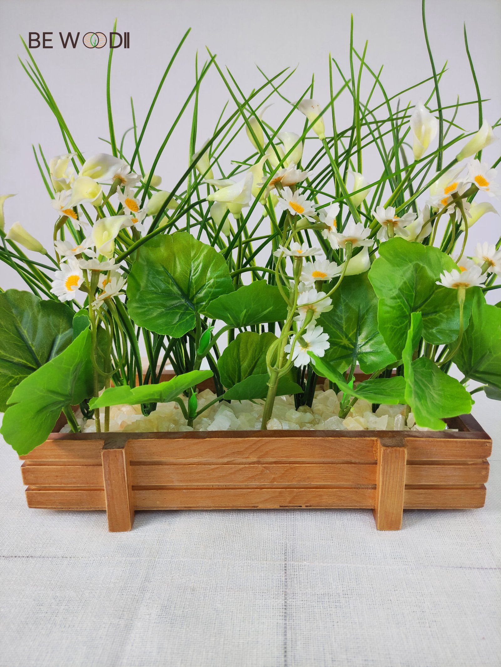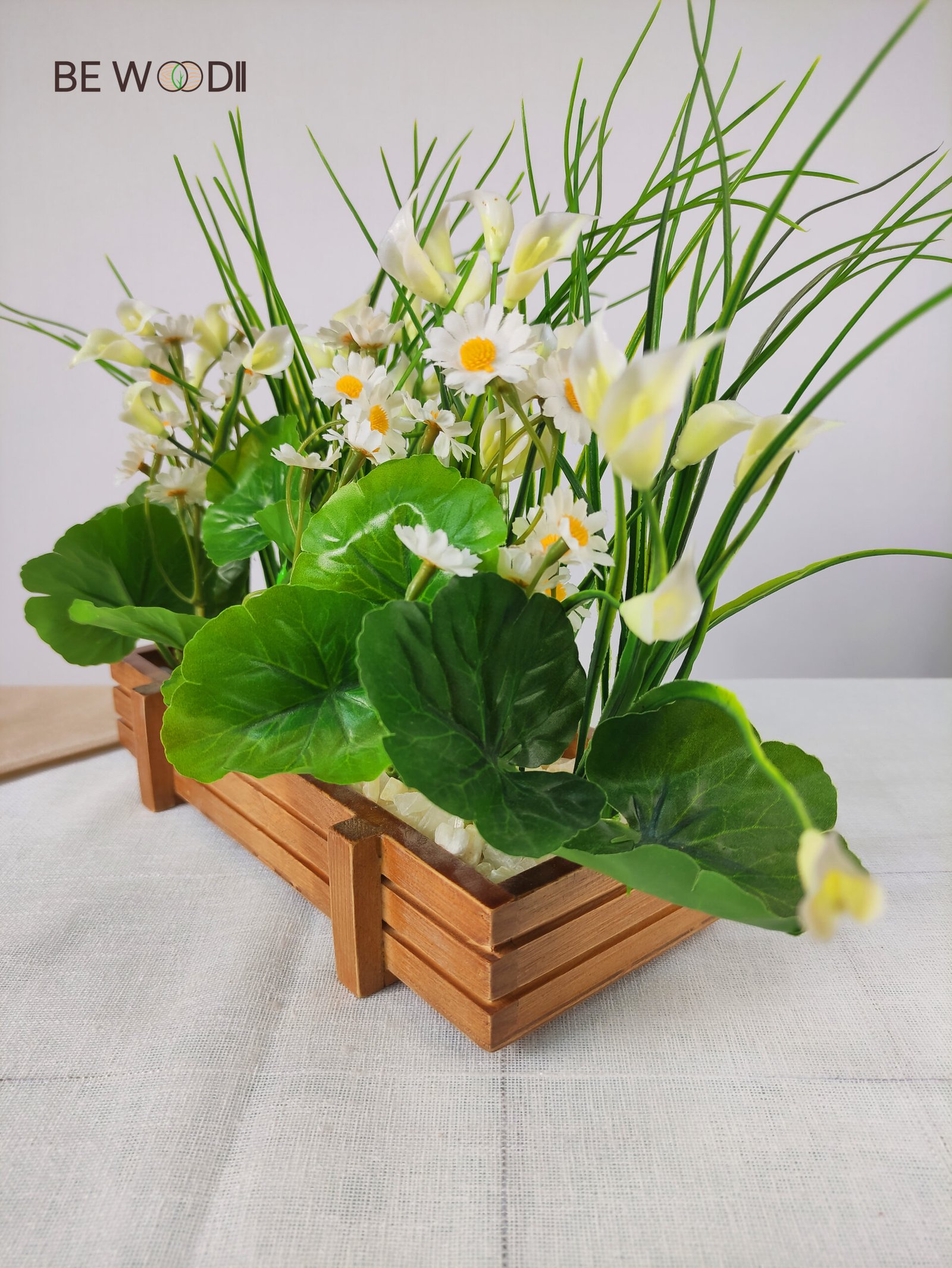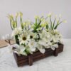 Bring natural elegance and freshness to your space with this artificial mixed floral arrangement, beautifully blending the charm of white daisies, delicate calla lilies, and lush green foliage. Each element is carefully arranged to create a balanced, vibrant composition that mimics the beauty of a blooming garden. Set in a handcrafted natural wooden planter box, this piece adds warmth and sophistication to any setting.